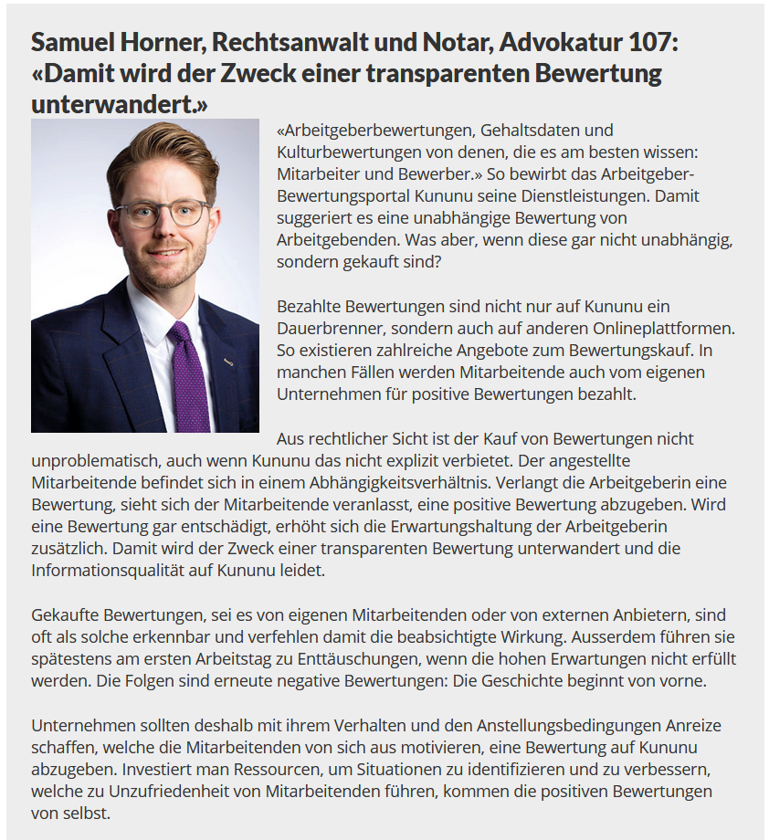 «Der Zweck heiligt die Mittel» oder doch eher «Ehrlich währt am Längsten»? Geht es um bezahlte Kununu-Einträge von (ehemaligen) Mitarbeitenden, sind sich unsere drei Experten ziemlich einig, welches Sprichwort Arbeitgebende wörtlich nehmen sollten. Bezahlte Arbeitgeberbewertungen sind weder aus rechtlicher Sicht zu empfehlen, noch wird damit der beabsichtigte Zweck erreicht. Erfahren Sie mehr im Beitrag von RA Samuel Horner.
